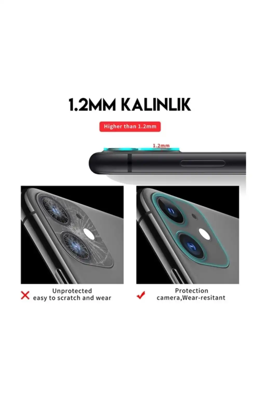 Günlük kullanım için uygun olan bu kamera koruyucu cam, iPhone 11 kullanıcıları için kamera lenslerini korumaya destek olan bir aksesuardır.