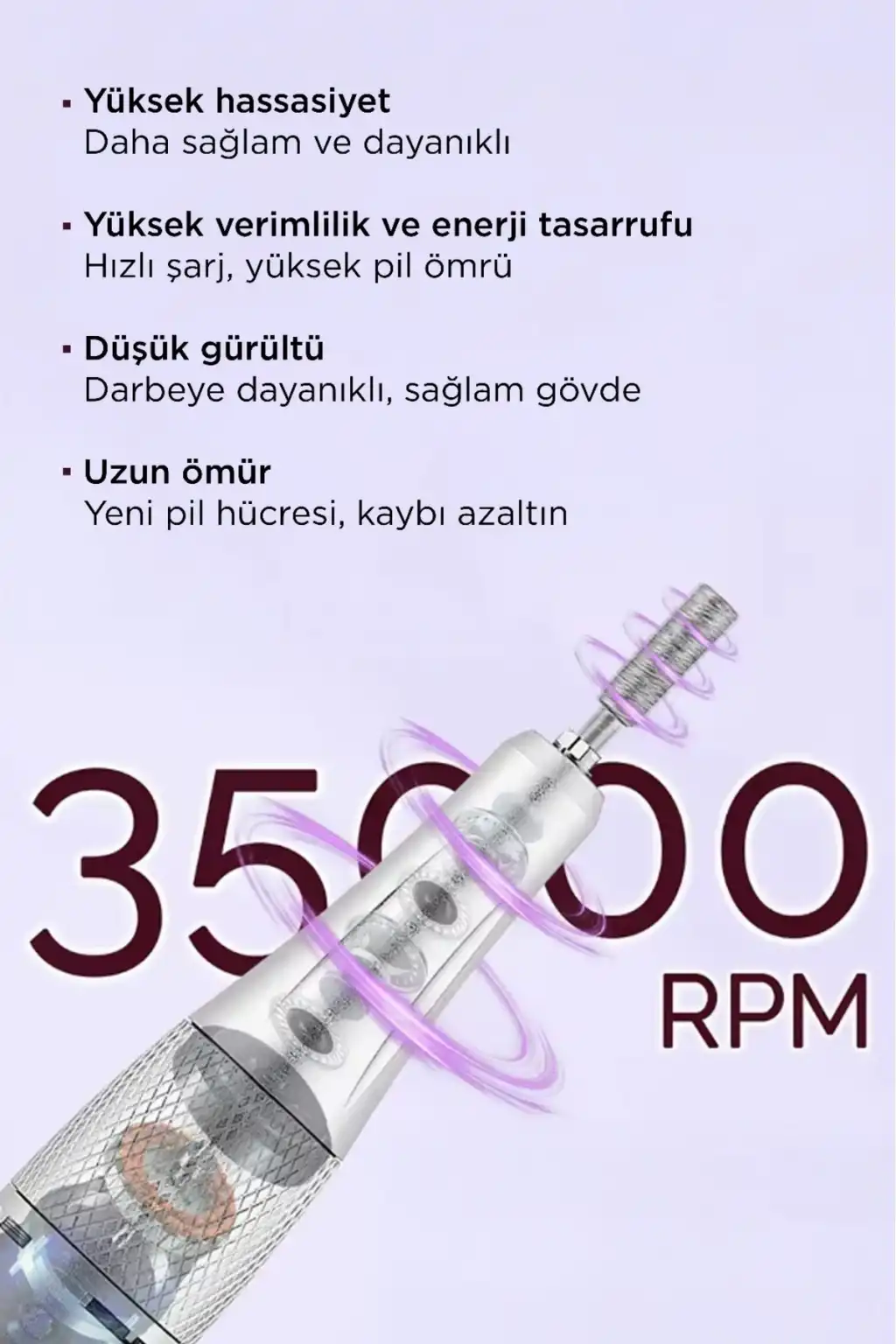 • 35.000 RPM motor gücü ile jel, akrilik ve protez tırnak işlemlerinde maksimum verim